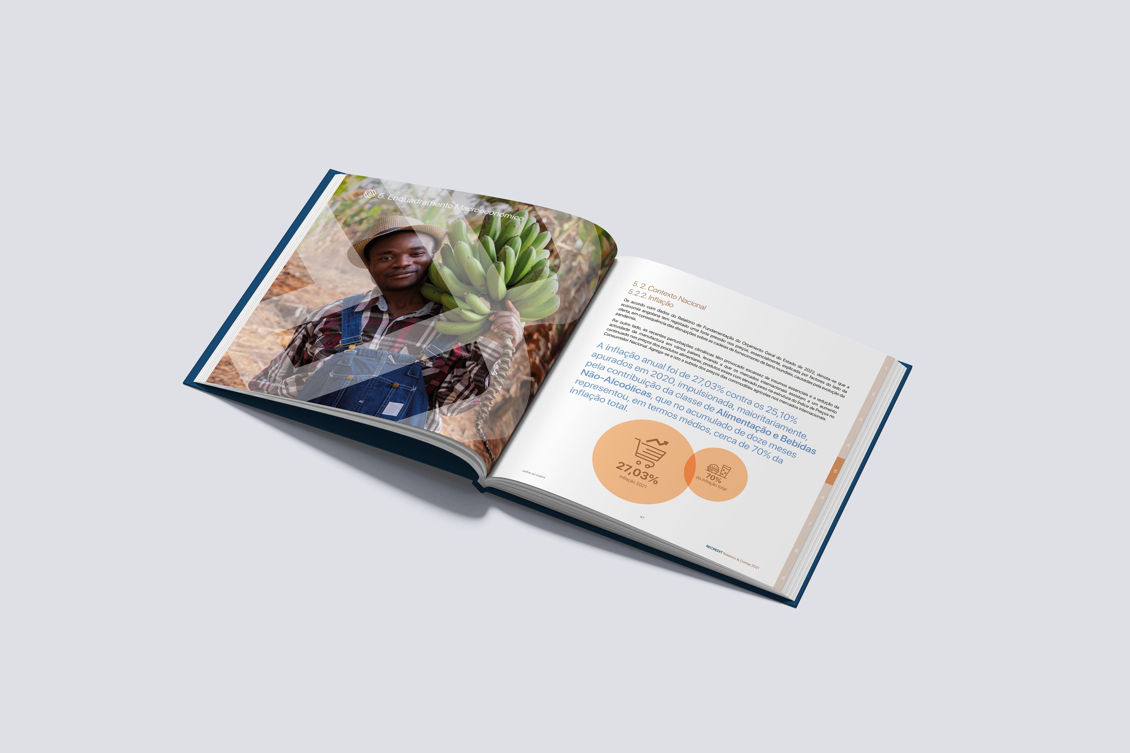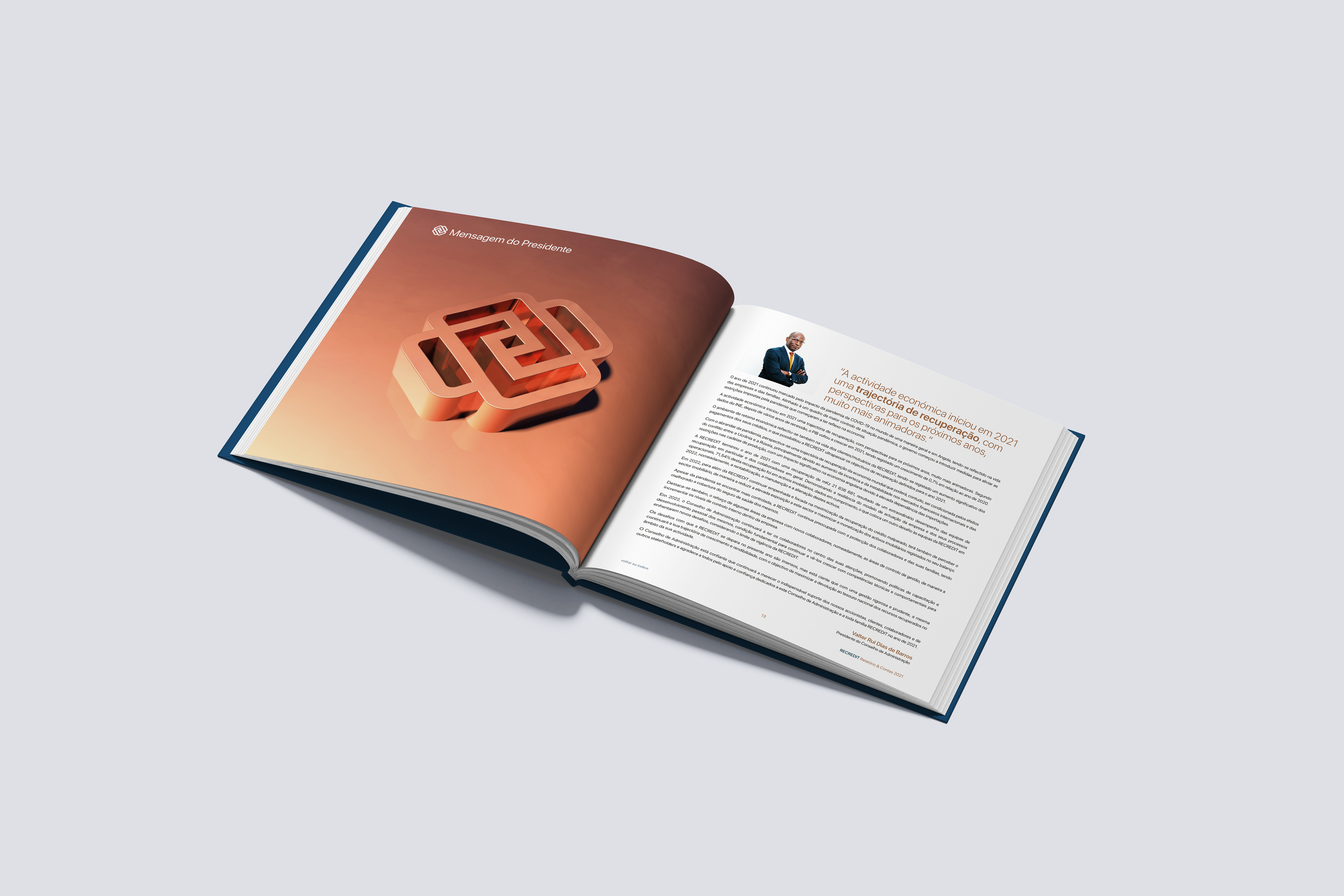 A Shiny People desenvolveu o Relatório & Contas da Recredit, combinando clareza editorial com uma abordagem visual sólida e institucional. O documento apresenta os principais indicadores financeiros e operacionais da entidade responsável pela recuperação de crédito em Angola, reforçando o seu papel estratégico no sistema económico nacional. Com uma estrutura informativa e um design cuidado, o relatório comunica com transparência e eficácia junto de stakeholders e entidades reguladoras.